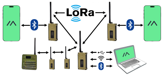 These radios are designed to rebroadcast messages they receive, forming a mesh network. This setup ensures that every group member, including those at the furthest distance, can receive messages.